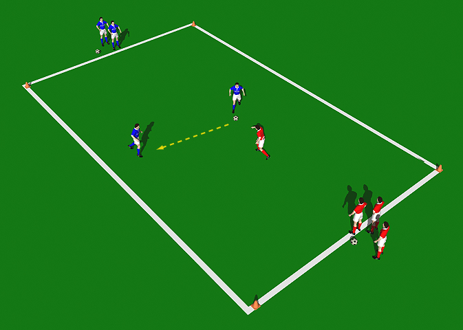 Place a goalkeeper in goal. Divide your team in three groups. Identify each group with colored vests. One group will start as the defending team and be positioned in the penalty area. The other two groups are placed at the two wide goals. The practice starts with (group one) serving a ball to one of the defenders and receiving a return pass. Once the attackers receive the return pass the game is live. The object is for the attacking team to try and score and the defending team to win the ball. Once the defending team wins the ball, one defender must run forward with the ball