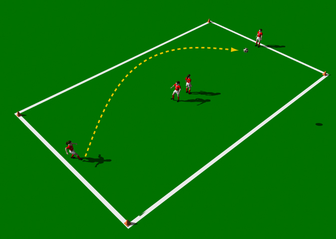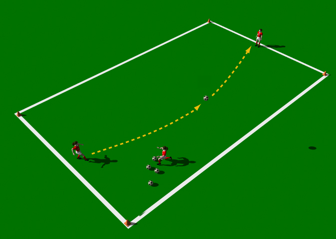 Three players are positioned in a grid 10 yards x 30 yards. One player acts as a server, one as a receiving player and the other to catch the lofted pass. The server rolls the ball for the receiver to pass first time to the catcher