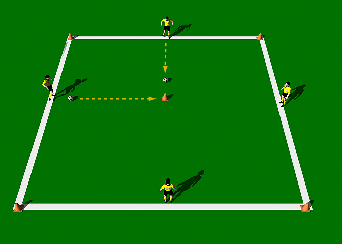 Four players are positioned in a grid 10 yards by 10 yards. Players work in pairs with their partner on the opposite side of the grid. On the coach’s command, the first pair to knock down the cone in the center of the grid wins.