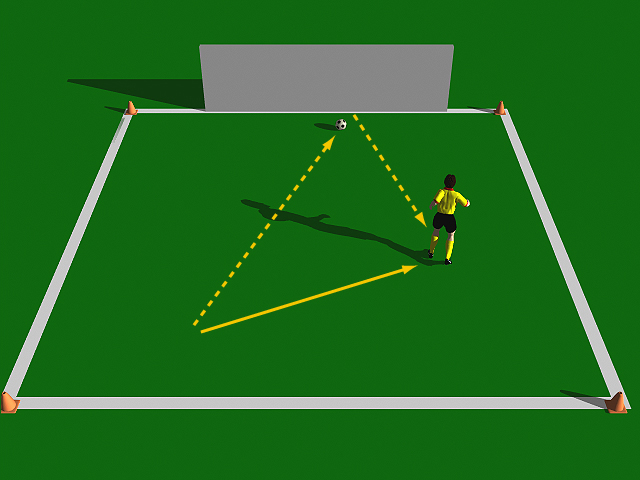 | From the "base-line" between the two cones, strike the ball at various angles off the wall. On the rebound move forward into the path of the ball with optimum speed. Control the ball efficiently and repeat practice. Vary the speed of the and height of which you strike the ball off the wall, to allow for realistic service. |