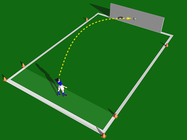 | To determine your average heading distance stands against the wall and heads the ball outwards towards the two cones. Where ever the ball bounces acts as your base line. For this practice. Move the cones to this spot and work from that line. From the cones, throw the ball slightly forward and up into the air. On it's descent head the ball high and long towards the wall. The higher the ball hits the wall the more powerful your heading will become. Be alert to all rebounds and control them efficiently. Jog back to the base line and repeat practice. An aggressive frame of mind is vital. |