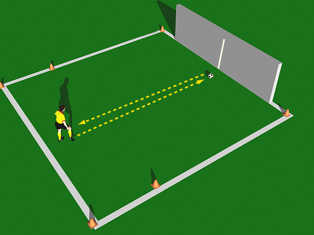 | From the "base-line" between the two cones, pass the ball firmly off the wall. Aim at the line marked on the wall to improve accuracy, then control the rebound efficiently and restart. Vary this practice by first controlling the ball before passing then progress to first time passing. |
