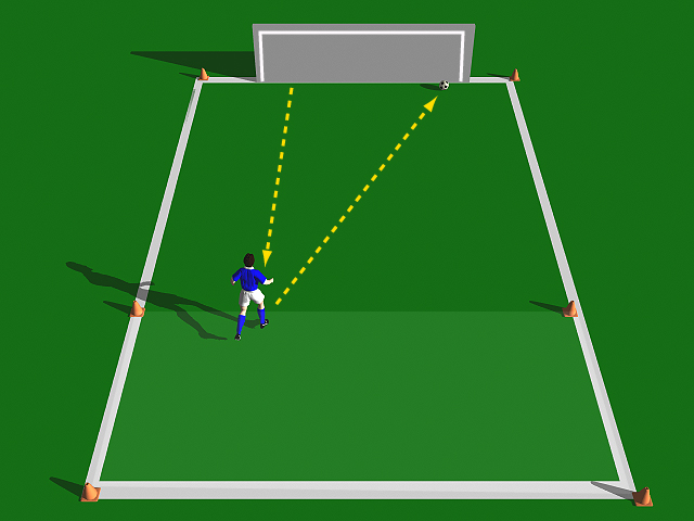 | From the “base-line” between the two cones, strike the ball firmly towards the opposite wall, approach the oncoming rebound with a positive frame of mind and strike the ball at the goal, placing accuracy before power, be alert and again continue this sequence by striking the rebounds consecutively. Use a variety of shooting techniques i.e. volley drive, swerved, etc. |