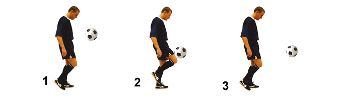 Step Three: Immediately on impact, push out with the thigh and redirect the ball into available space. Do not withdraw the thigh on impact, as this will cushion the ball. As the player is redirecting the ball on impact, the head and upper body should be over the ball.
