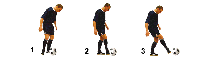 Step Two: Strike the ball with the inside of the kicking foot through the horizontal mid-line of the ball. The head should be kept steady and eye's fixed firmly on the ball. The head weighs approximately 10 pounds, so any unnecessary tilting of the head will affect the whole balance of the body.