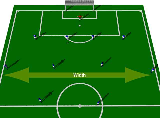 Obviously since defenders wish to deny the opposition space and attackers wish to exploit space, then the principle of width is used. Width needs to be analyzed as being important in the defensive third of the field, midfield third and the attacking third.