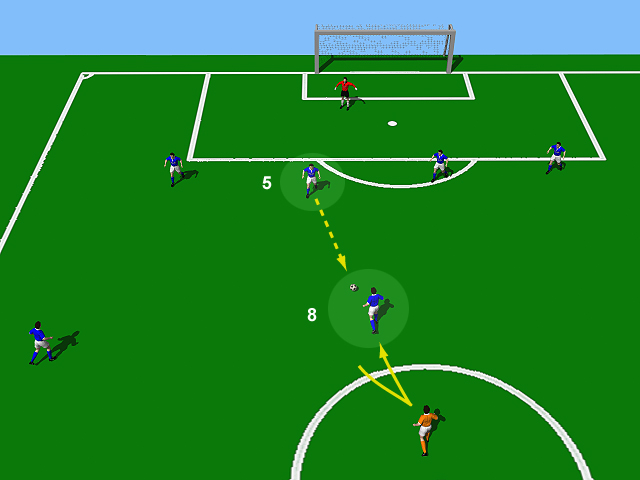 The central midfielder (# 8) takes the defender away from the ball and then checks back to receive a pass