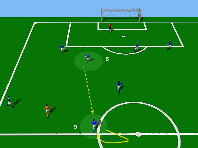 Near forward (# 9) takes the defender away from the ball and checks back to take the pass into feet.