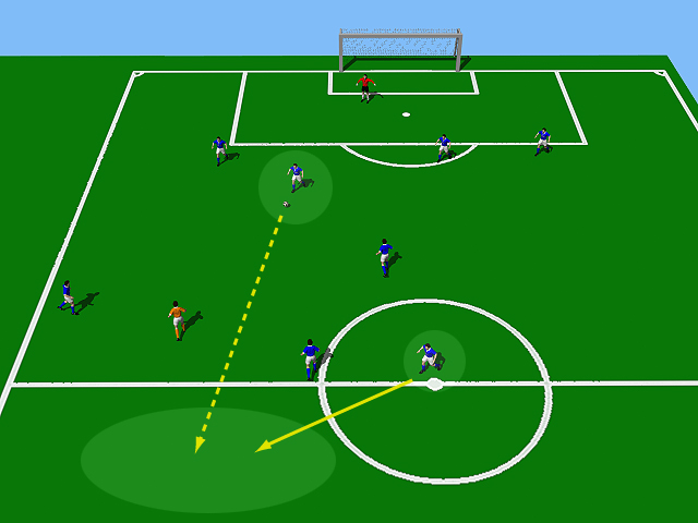 Near forward (# 9) takes the defender away from the ball and checks back to take the pass into feet.