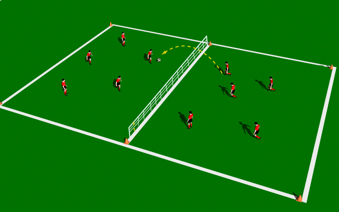 Split the group into two teams one on each side of the net. Team must have serve to win a point. Players can use their head, chest, thighs and feet to control the ball. The ball is only allowed to bounce 'once" in the area. Can
