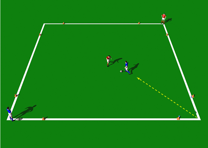 A player is positioned at each corner of a grid 10 yards x 10 yards. Small goals are made using cones which are placed approximately 1 yard apart. The players alternate in pairs playing one versus one across the grid.