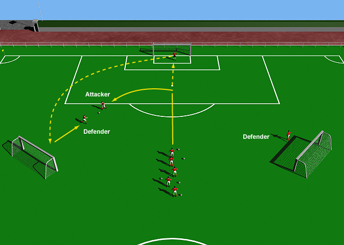 Place a goalkeeper in goal. Position a group of players with a ball each in the center of the field. Place a defender