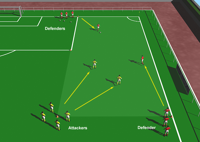 The play starts with one of the 2 attackers playing a diagonal ball towards the opposite corner flag. The attackers cannot move until the defender touches the ball. As soon as the yellow defenders have the ball they must attempt to get to the end of the grid with possession of the ball. If they do, they score 3 points.