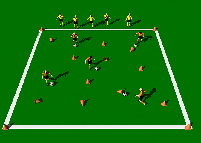 This is an introductory exercise for dribbling. The major focus is on vision, change of direction and control over the ball. This can also be used as a fun warm up activity with your team. |