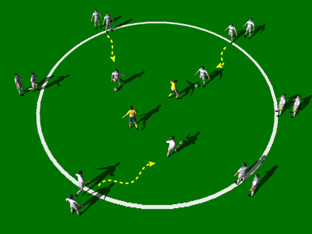 Position a large group of player around the outside of the center circle. Place two defenders inside the circle. Have player hold a bib to identify who is a defender. The outside players dribble across the center circle attempting to find another player with a pass. If a player is tackled by a defender, they must take the defenders place in the middle. As there are only two defenders, the players must look for opportunities to run with the ball into space if they are not confronted.