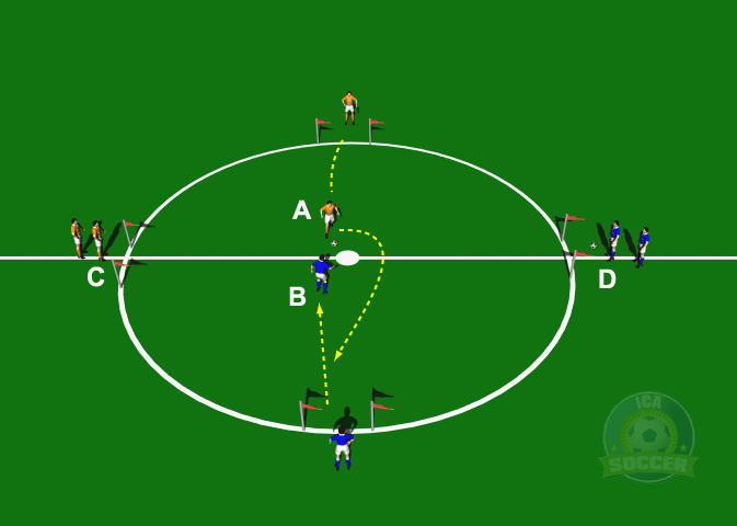 The sequence starts when player "B" passes the ball to player "A". Player "A" then attacks player "B" with the ball and tries to score a goal between the two flag poles. If player "B" can win the ball he can counter attack and score.