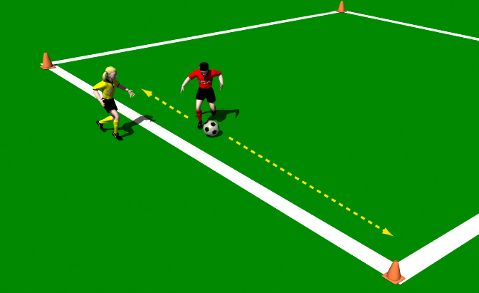dead at either of the cones. The dribbling players knees should be bent and center of gravity low for an explosive start. If the defender does not move by using body movements, then move the ball to move the position of the defender. Once the defender is off balance the player should explode into the opposite direction. Try to face the defender at all times.