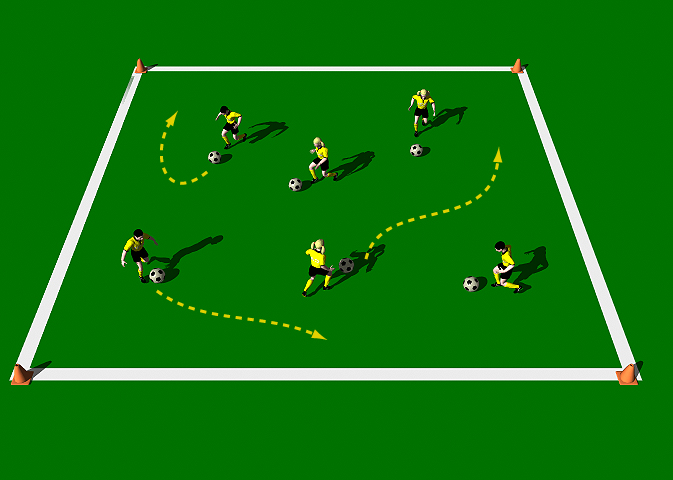 The group is positioned in a grid 20 yards x 20 yards. Each player has a ball. The practice starts with the players dribbling their ball freely around the inside of the grid. The players must instantly react to a series of commands