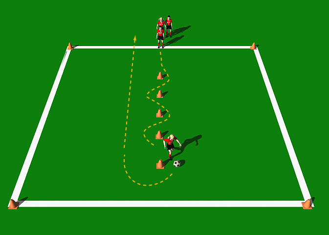 Divide your players into two small groups. Each player has a ball. Place 4 cones in a line, approximately 1 yard apart. The two teams play a competition to see which team can dribble (wiggle) through the cones first.