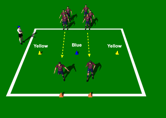 Coaching Pointers: Divide your team into 2 equal groups. Team up players by speed. Place colored cones as in the diagram above. On the coaches “command” players go flat out and race to the “orange cones” at the opposite end of the grid. As the players race to the “orange cones” the coach can call out “turn”. If he does then the players must turn quickly and run back to the starting line. If the coach calls out “Yellow” or “Blue” the players must turn and sprint to that cone, then race back to the starting line.