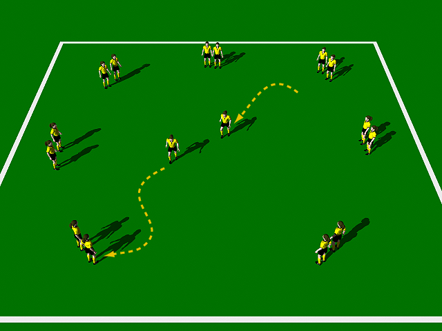 Two players start the exercise. Player "A" tries to tag player "B", player "B" can run anywhere to avoid being tagged, inside or outside of the circle. If player "B" is tagged they must now chase player "A". As the player runs around trying to avoid being tagged, they can rest by standing next to any of the pairs or players.