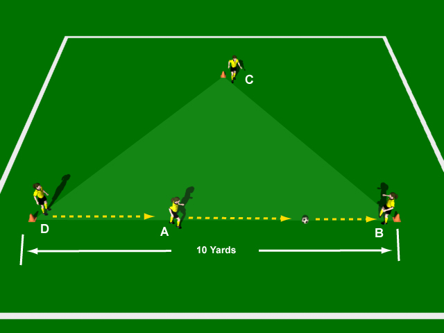 The exercise starts with the player "A" passing the ball to player "B". After passing the ball the player must sprint "flat out" to the next cone. This is repeated around the triangle.