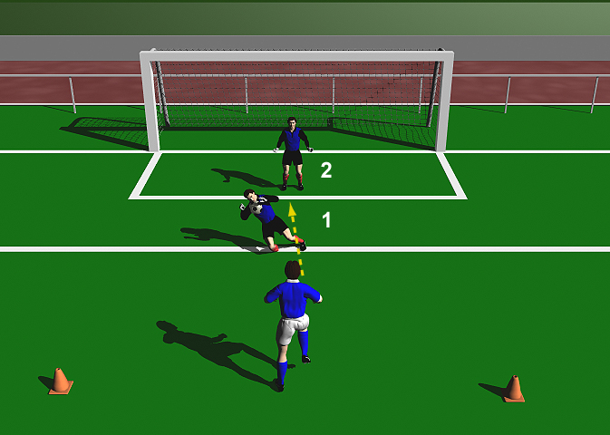 Two goalkeepers are positioned in the penalty area, one on the penalty spot and the other on the six yard line. Goalkeepers are assigned a number, either 1 or 2. The server calls out 1 or 2 as he volleys the ball to the selected goalkeeper. Whichever goalkeeper’s number is called must save the ball and return it back to the server. The other goalkeeper must dive to any side and recover as quickly as possible readying himself for the next command.