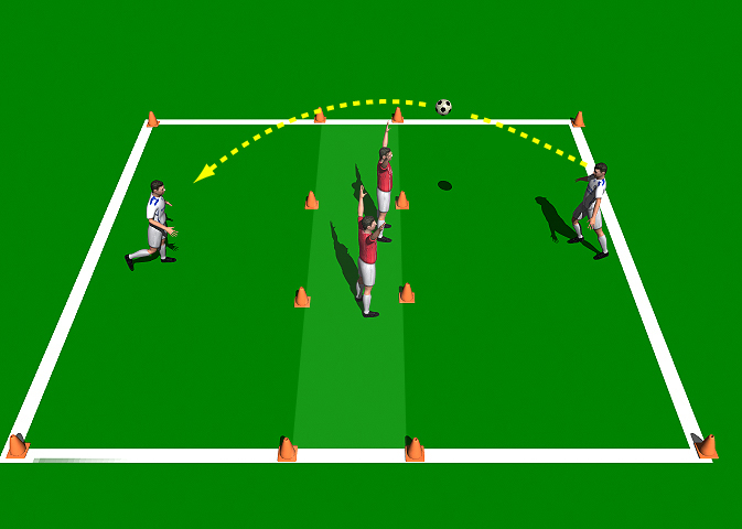 Four players are positioned in a grid 10 yards x 10 yards, using one ball. The players are divided into teams of 2. The practice starts with 2 attacking players and (2 defensive players who are restricted to the middle zone). The attacking players attempt to head the ball over the 2 defensive players. Each time they head the ball over the defensive players they get a Goal.