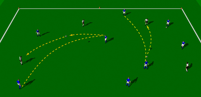 It Involves plenty of repetition and constant movement. Make a grid approximately 40 yards by 40 yards. Position a large group of players (blue) in the grid. Place 4 defenders (green) inside the grid.