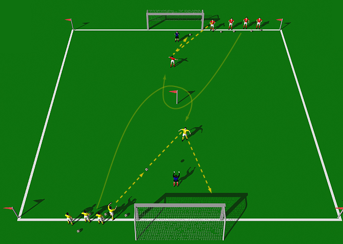 A group of players with a ball each are placed at opposite goals. Two goalkeepers are positioned in goal. Identify groups using colored bibs. A cone is placed in the middle of the goals. On the coaches command, the first player from each group runs around the cone and has to score as quickly as possible with a header. The second