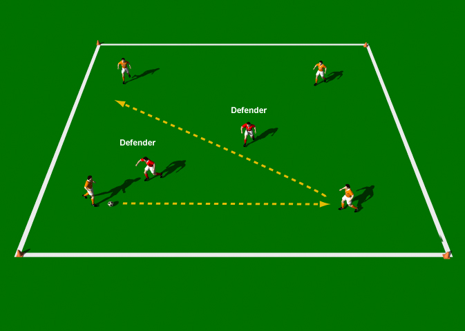 The point of the exercise is for the players to retain the ball by moving it around with square and diagonal passes while two opponents try to intercept. One of the defending pair puts pressure on the man with the ball in such a