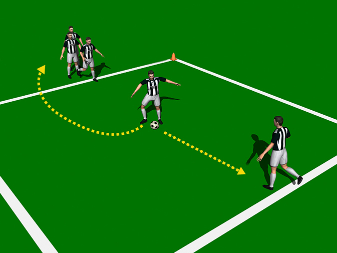 Area 10 x 10 yards. Three players. One ball, Four cones.
