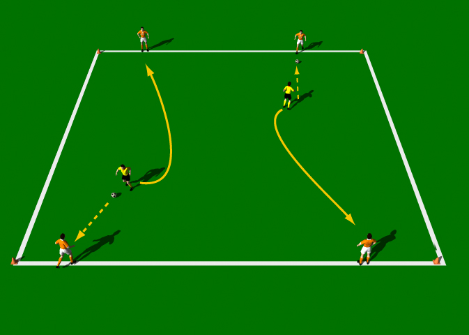 A player is positioned in each corner of the grid. Two players in the center rotate receiving passes from the corner players. Players in the center must try and pass the ball “first time” to either of the two servers they are facing.