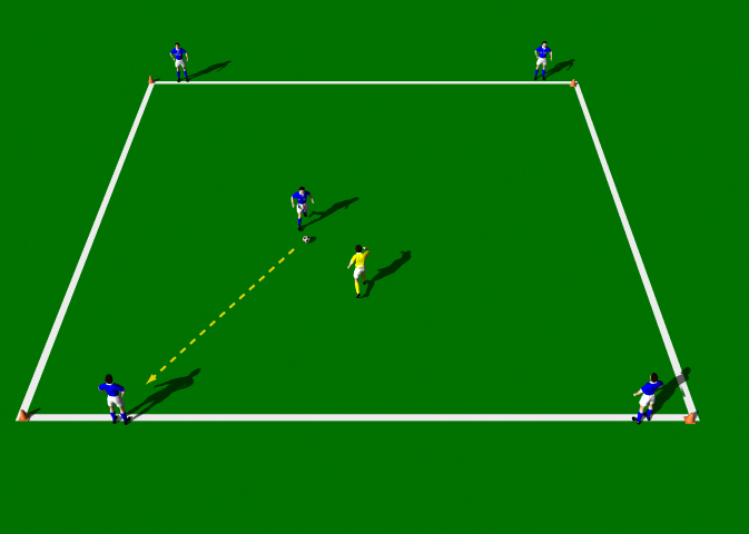 The playing area is determined by four players each one standing in a corner of the square, with the other two players within this square. The man with the ball can use the four corner players to exchange passes. The roles
