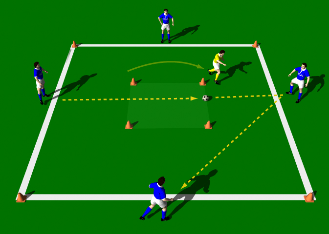 The defender cannot enter the center square. The outside players cannot enter the grid. Players in possession are awarded one goal for each time they penetrate the center square. The defenders should work with high intensity to ensure quick decision making by the players with the ball.