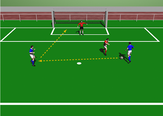 4 players; a midfielder + a forward against a defender + a goalkeeper. Playing area: half the pitch, with a standard goal.