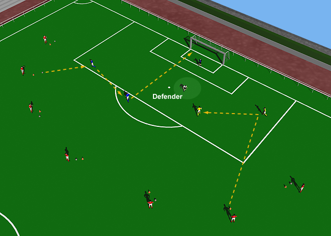 Each set of forwards alternate attacking the goal. One forward makes a run for the ball (they can receive the ball from any server). The forward then turns with the ball and either;
