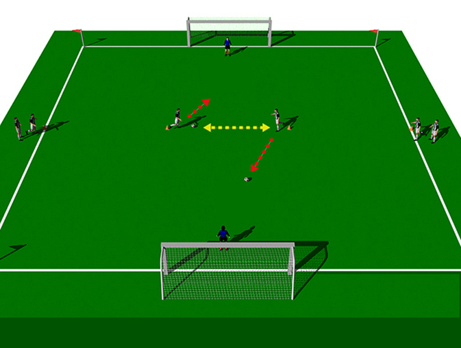 Divide your players into two groups and position as in the diagram above. Two players from opposite sides play “one touch” passes to each other between the 2 middle cones. One the Coach’s whistle, the players quickly react to finish “first time” on goal. Pre assign which goal each player will attack. The first player to score is the winner!