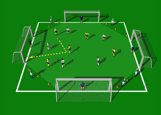 This is a progression from the "One Touch Shooting Drill". Divide your players into three even teams of 4, 5 or 6 players. Identify team by using different colored bibs. Position a goalkeeper in each goal. Organize your playing