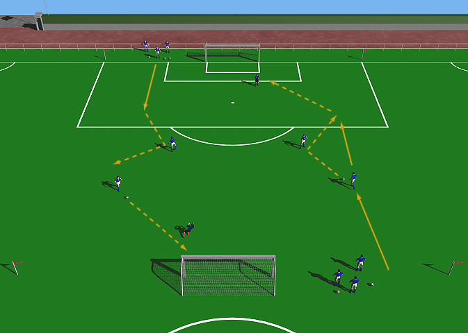 A small group of players are placed at the side of each goal. Two target players are positioned in the middle of the area.