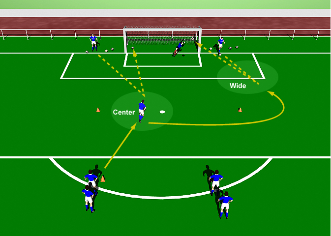 A group of players are placed at the edge of the penalty area. Two servers are positioned each side of the goal.