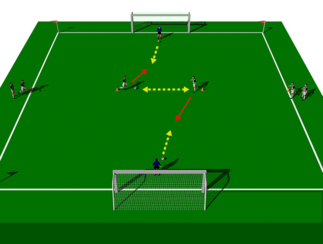 Two players from opposite sides play “one touch” passes to each other between the 2 middle cones. When the coach shouts “Left” or “Right” the players leave the ball and quickly react to receive a pass from the goalkeeper to finish “first time” on goal