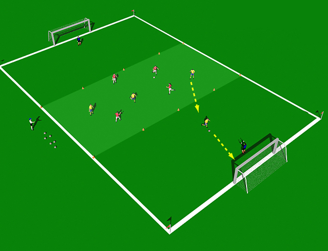 Place two equal teams in the middle channel. Players are restricted to the middle channel until they can get 4 consecutive passes. Once they string 4 passes together, the player runs and attacks the goal to try and score. Defenders are not allowed to run back and chase the attacker. Once the player attacks, the coach should serve the ball quickly for a team to take advantage of a “numbers down” situation. This will also demand the strikers to recover quickly after attacking.