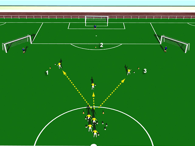 To start the drill, a goalkeeper is placed in each goal. Place the attacking players (with a ball each) at the starting position. On the coach's command, the first attacking player runs with the ball and shoots the ball so the goalkeeper can make a save. This is a warm up for the keepers. The next player inline repeats the drill. This is continued for several minutes until the goalkeepers are thoroughly ready for the shooting exercise.