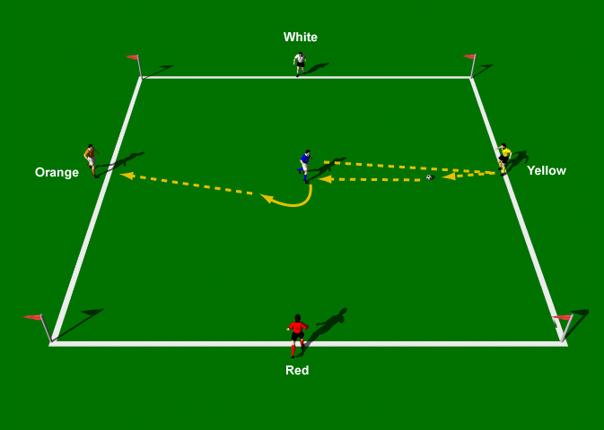 Place 4 players on the outside of the square and a player in the center as in the diagram above. Each player must wear a different color bib. The player in the center starts by passing a ball to a player on the outside of the square. The player who receives the pass plays the ball back first time. As he does he must shout out another color. The receiving player turns and passes to that color and the practice is repeated in that manner. Have player work for 3 minutes and change center player.