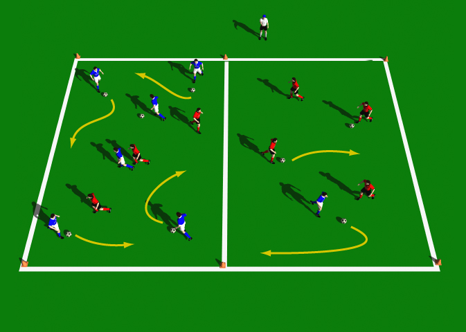 Divide the team into two groups. Identify groups by using colored bibs. One team has a ball each can move anywhere within their own grid. The opposing team has to try and steal as many balls from the team in 3 minutes.