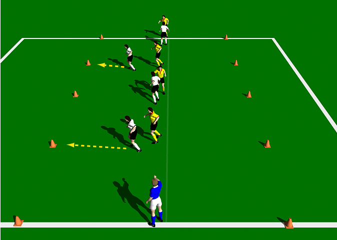 When the coach calls one of the names, the players race their partner to the side, in line with the cone and back to the starting position. First player back wins. Coach can vary the practice by having players run the opposite side he calls. Also perform with a ball. Make a competition between partners, award a point for each time the player wins the race. First player to 10 wins. |