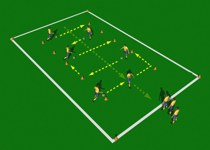 Players are divided into pairs. Pairs in turn, perform the following exercises; ( it is vital to leave the ball "dead" at the cone for the next pair).